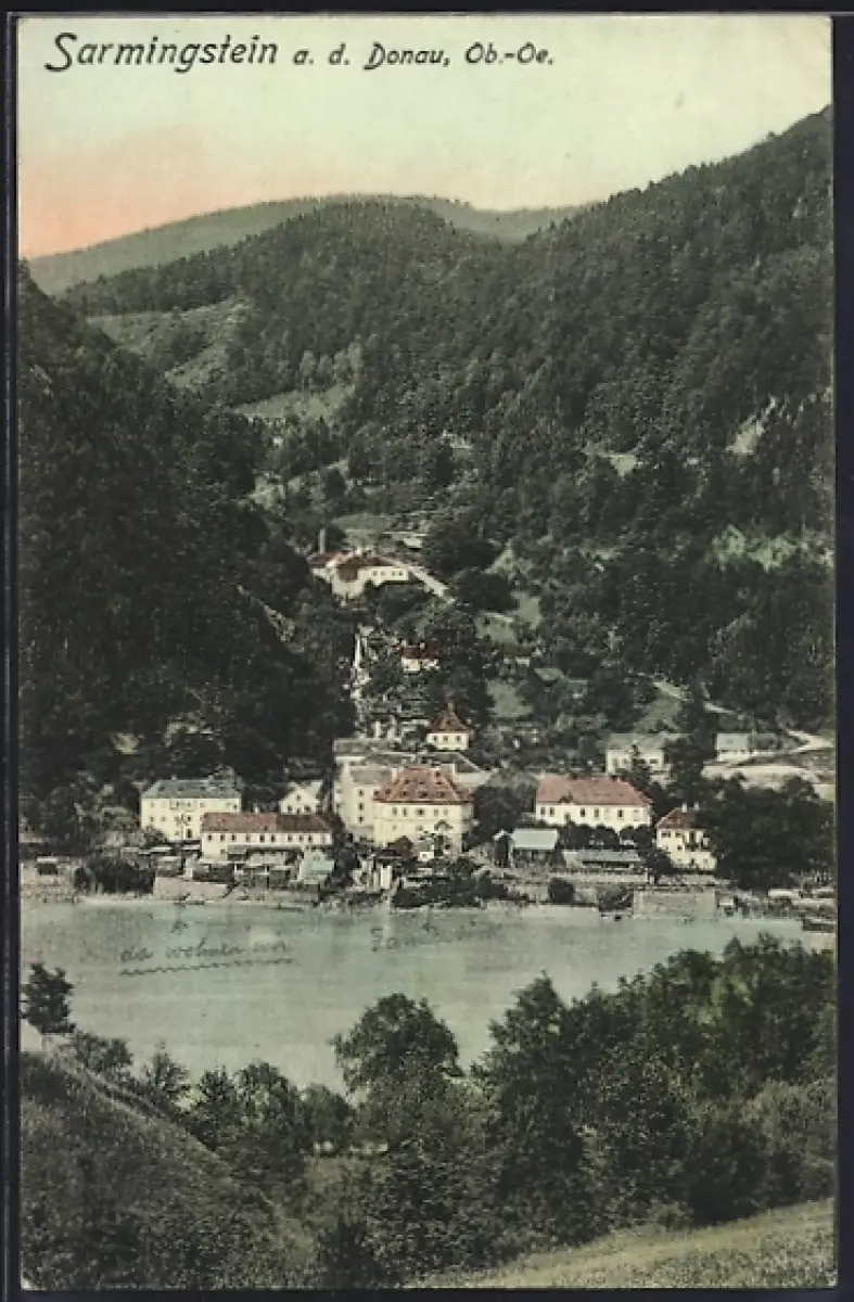 AK Sarmingstein a. d. Donau, Ortsansicht mit Talblick