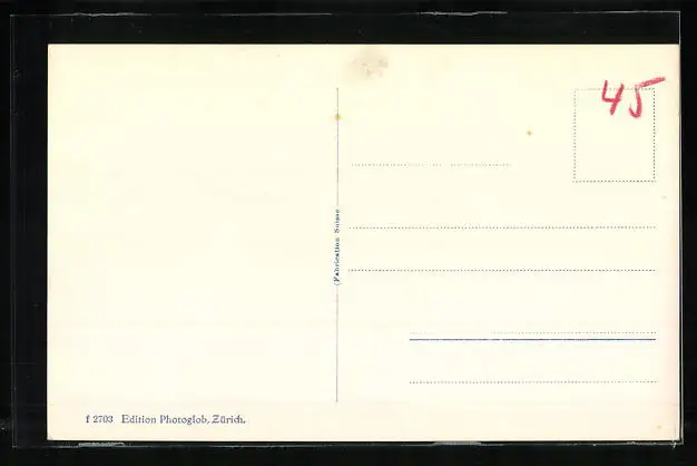 Personenbezogene Daten auf der Rückseite der Karte wurden durch blauen Textmarker unkenntlich gemacht. Die blauen Stellen sind auf die Vorderseite durchgeweicht und wirken sich negativ auf das Postkartenfoto aus
