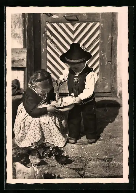 AK Sarntal, Zwei Kinder in Tracht mit einer Schar Küken