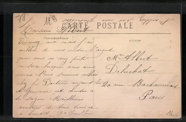 Personenbezogene Daten auf der Rückseite der Karte wurden durch blauen Textmarker unkenntlich gemacht. Die blauen Stellen sind auf die Vorderseite durchgeweicht und wirken sich negativ auf das Postkartenfoto aus