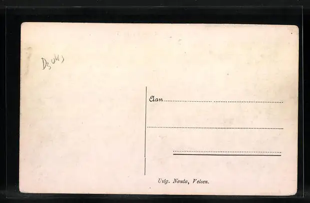 Personenbezogene Daten auf der Rückseite der Karte wurden durch blauen Textmarker unkenntlich gemacht. Die blauen Stellen sind auf die Vorderseite durchgeweicht und wirken sich negativ auf das Postkartenfoto aus