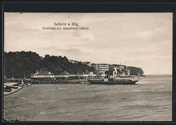 AK Sassnitz a. Rüg., Seebrücke mit Dampfjacht Sassnitz