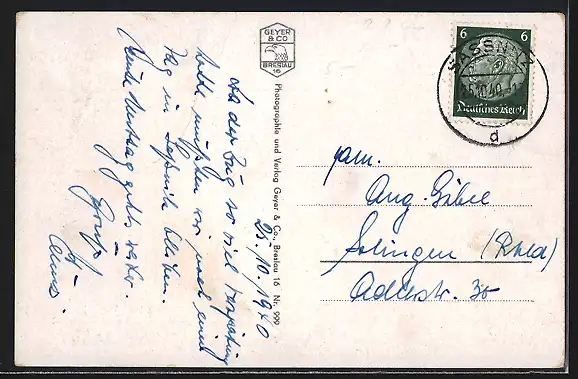 alte Ansichtskarte, gelaufen 1940, Bugspur oben mittig, guter Zustand