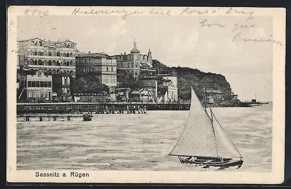 AK Sassnitz a. Rügen, Uferpartie mit Hotel am Meer