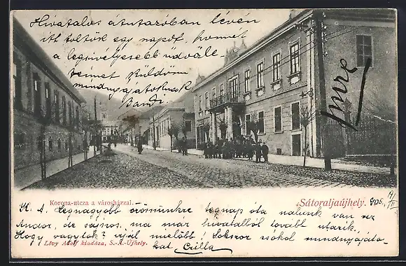 AK Sátoraljaújhely, Korona-utcza a városházzal