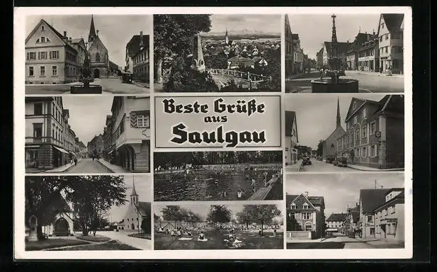 AK Saulgau, Brunnen, Kirche, Freibad, Teilansicht