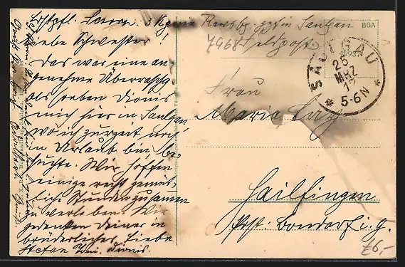 Personenbezogene Daten auf der Rückseite der Karte wurden durch blauen Textmarker unkenntlich gemacht. Die blauen Stellen sind auf die Vorderseite durchgeweicht und wirken sich negativ auf das Postkartenfoto aus