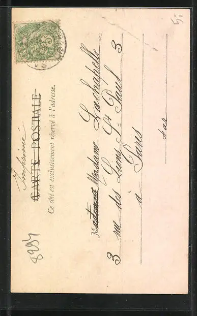 Personenbezogene Daten auf der Rückseite der Karte wurden durch blauen Textmarker unkenntlich gemacht. Die blauen Stellen sind auf die Vorderseite durchgeweicht und wirken sich negativ auf das Postkartenfoto aus