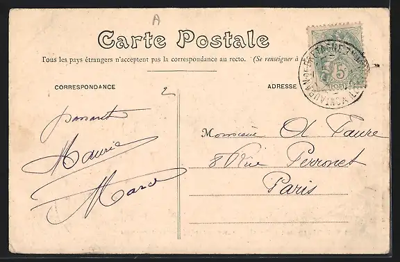 Personenbezogene Daten auf der Rückseite der Karte wurden durch blauen Textmarker unkenntlich gemacht. Die blauen Stellen sind auf die Vorderseite durchgeweicht und wirken sich negativ auf das Postkartenfoto aus