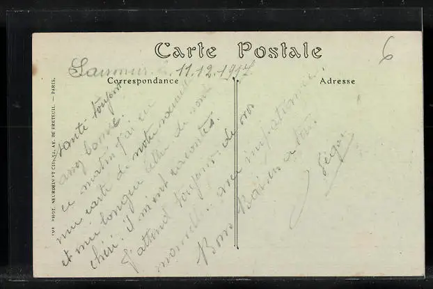 Personenbezogene Daten auf der Rückseite der Karte wurden durch blauen Textmarker unkenntlich gemacht. Die blauen Stellen sind auf die Vorderseite durchgeweicht und wirken sich negativ auf das Postkartenfoto aus
