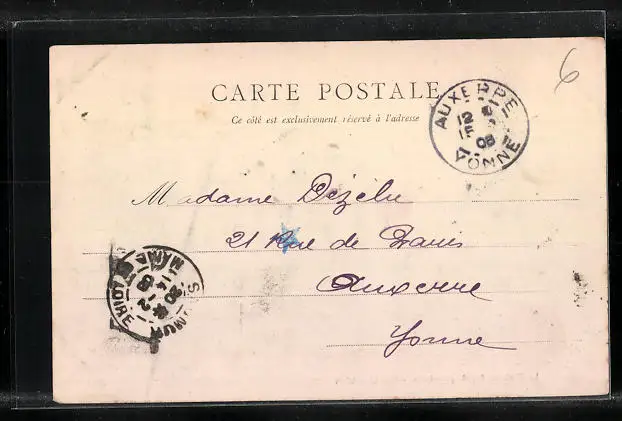 Personenbezogene Daten auf der Rückseite der Karte wurden durch blauen Textmarker unkenntlich gemacht. Die blauen Stellen sind auf die Vorderseite durchgeweicht und wirken sich negativ auf das Postkartenfoto aus