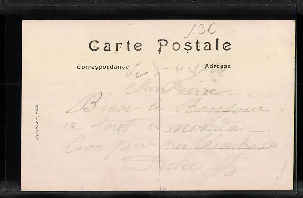 Personenbezogene Daten auf der Rückseite der Karte wurden durch blauen Textmarker unkenntlich gemacht. Die blauen Stellen sind auf die Vorderseite durchgeweicht und wirken sich negativ auf das Postkartenfoto aus