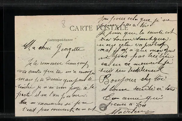 Personenbezogene Daten auf der Rückseite der Karte wurden durch blauen Textmarker unkenntlich gemacht. Die blauen Stellen sind auf die Vorderseite durchgeweicht und wirken sich negativ auf das Postkartenfoto aus