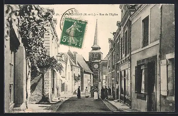 AK Savennières, Rue de l`Église avec vue sur le clocher et des passants