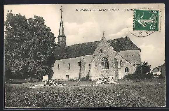 AK Savigny-en-Septaine, L`Église et groupe d`enfants devant le bâtiment