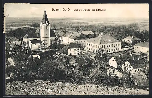 AK Saxen / O.-Ö., Ortsansicht mit Kirche vom Berg aus