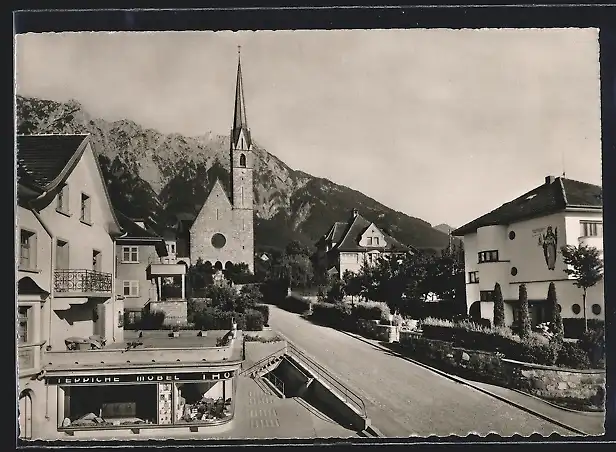 AK Schaan, Laurenziuskirche mit Teppichgeschäft und Fürstensteig