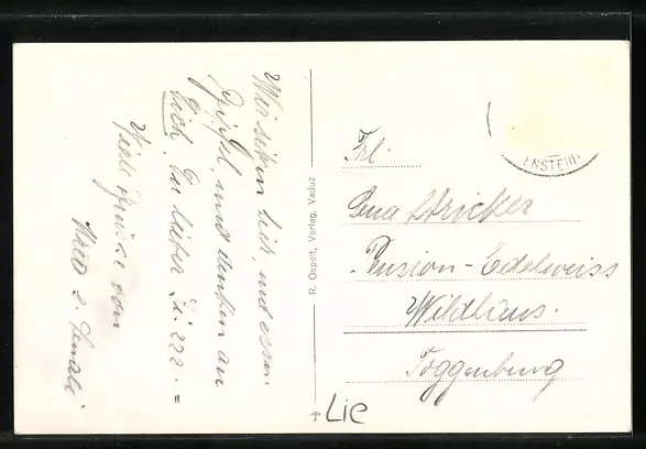 Personenbezogene Daten auf der Rückseite der Karte wurden durch blauen Textmarker unkenntlich gemacht. Die blauen Stellen sind auf die Vorderseite durchgeweicht und wirken sich negativ auf das Postkartenfoto aus