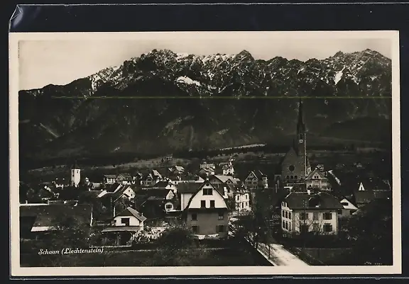 AK Schaan, Ortsansicht gegen Bergpanorama