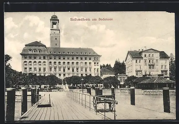 AK Schachen /Bodensee, Seesteig mit Blick auf Ufergebäude