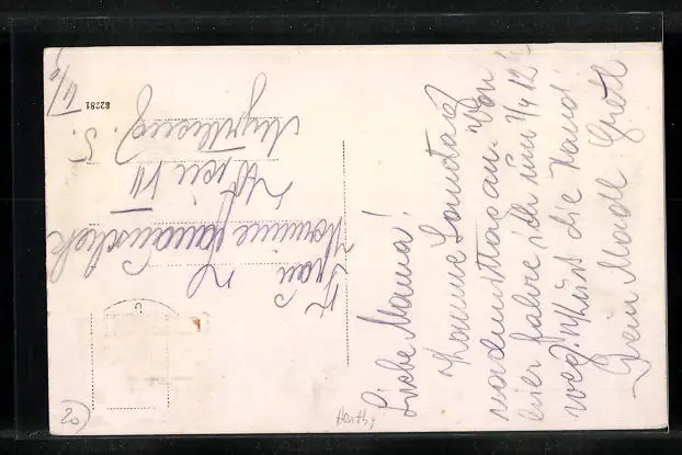Personenbezogene Daten auf der Rückseite der Karte wurden durch blauen Textmarker unkenntlich gemacht. Die blauen Stellen sind auf die Vorderseite durchgeweicht und wirken sich negativ auf das Postkartenfoto aus
