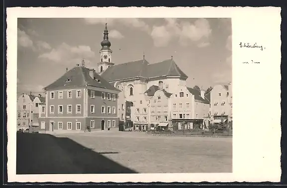 AK Schärding a. Inn, Partie auf dem Stadtplatz mit Kirchturm