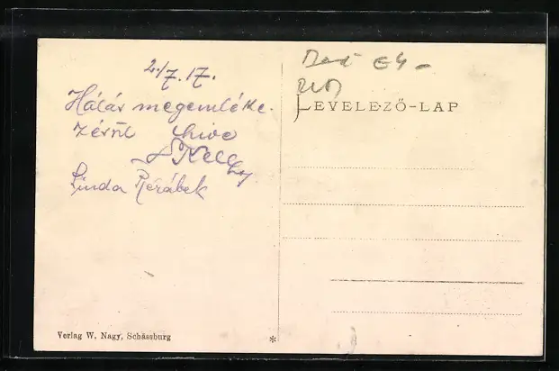 Personenbezogene Daten auf der Rückseite der Karte wurden durch blauen Textmarker unkenntlich gemacht. Die blauen Stellen sind auf die Vorderseite durchgeweicht und wirken sich negativ auf das Postkartenfoto aus