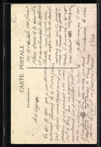 Personenbezogene Daten auf der Rückseite der Karte wurden durch blauen Textmarker unkenntlich gemacht. Die blauen Stellen sind auf die Vorderseite durchgeweicht und wirken sich negativ auf das Postkartenfoto aus