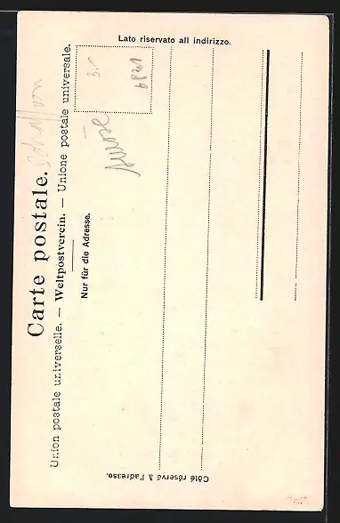 Personenbezogene Daten auf der Rückseite der Karte wurden durch blauen Textmarker unkenntlich gemacht. Die blauen Stellen sind auf die Vorderseite durchgeweicht und wirken sich negativ auf das Postkartenfoto aus