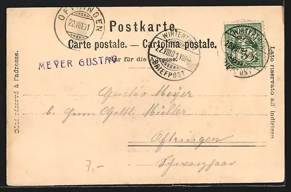 Personenbezogene Daten auf der Rückseite der Karte wurden durch blauen Textmarker unkenntlich gemacht. Die blauen Stellen sind auf die Vorderseite durchgeweicht und wirken sich negativ auf das Postkartenfoto aus
