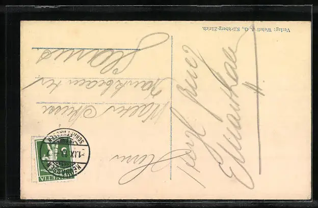 Personenbezogene Daten auf der Rückseite der Karte wurden durch blauen Textmarker unkenntlich gemacht. Die blauen Stellen sind auf die Vorderseite durchgeweicht und wirken sich negativ auf das Postkartenfoto aus