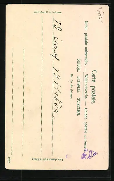 Personenbezogene Daten auf der Rückseite der Karte wurden durch blauen Textmarker unkenntlich gemacht. Die blauen Stellen sind auf die Vorderseite durchgeweicht und wirken sich negativ auf das Postkartenfoto aus