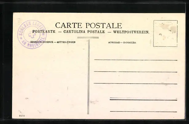 Personenbezogene Daten auf der Rückseite der Karte wurden durch blauen Textmarker unkenntlich gemacht. Die blauen Stellen sind auf die Vorderseite durchgeweicht und wirken sich negativ auf das Postkartenfoto aus