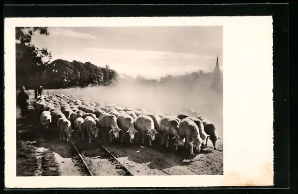 AK Schafherde auf staubigen Bahnschienen im Sommer