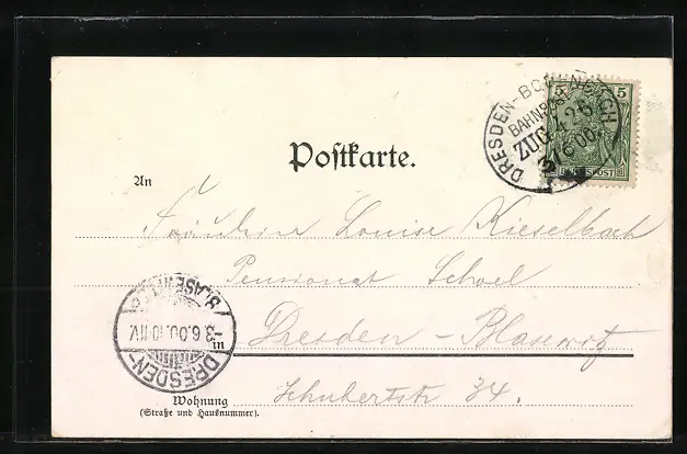 Personenbezogene Daten auf der Rückseite der Karte wurden durch blauen Textmarker unkenntlich gemacht. Die blauen Stellen sind auf die Vorderseite durchgeweicht und wirken sich negativ auf das Postkartenfoto aus
