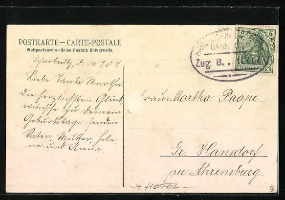 Personenbezogene Daten auf der Rückseite der Karte wurden durch blauen Textmarker unkenntlich gemacht. Die blauen Stellen sind auf die Vorderseite durchgeweicht und wirken sich negativ auf das Postkartenfoto aus