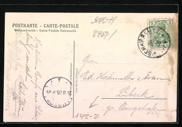 alte Ansichtskarte, gelaufen 1905, rückseitig Oberflächenschaden, Stempelspur, guter Zustand