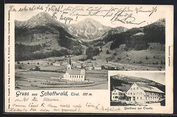 AK Schattwald, Gasthaus zur Traube, Ortsansicht