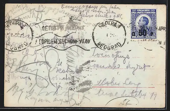 Personenbezogene Daten auf der Rückseite der Karte wurden durch blauen Textmarker unkenntlich gemacht. Die blauen Stellen sind auf die Vorderseite durchgeweicht und wirken sich negativ auf das Postkartenfoto aus