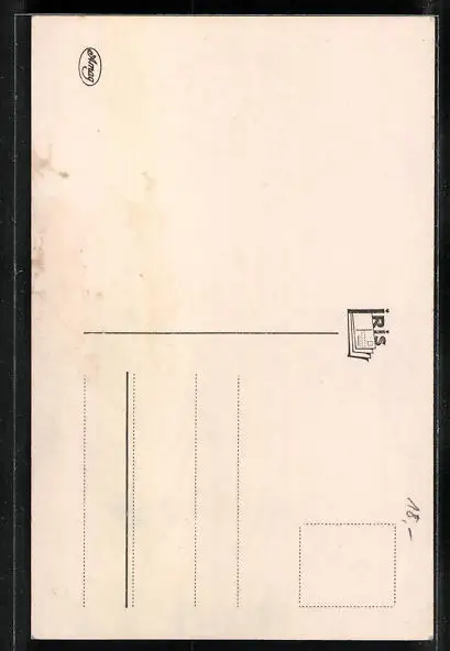 Personenbezogene Daten auf der Rückseite der Karte wurden durch blauen Textmarker unkenntlich gemacht. Die blauen Stellen sind auf die Vorderseite durchgeweicht und wirken sich negativ auf das Postkartenfoto aus