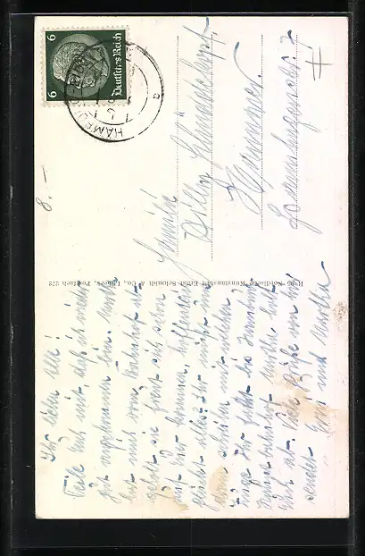 Personenbezogene Daten auf der Rückseite der Karte wurden durch blauen Textmarker unkenntlich gemacht. Die blauen Stellen sind auf die Vorderseite durchgeweicht und wirken sich negativ auf das Postkartenfoto aus