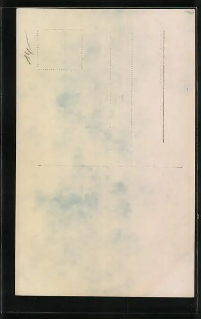 Personenbezogene Daten auf der Rückseite der Karte wurden durch blauen Textmarker unkenntlich gemacht. Die blauen Stellen sind auf die Vorderseite durchgeweicht und wirken sich negativ auf das Postkartenfoto aus