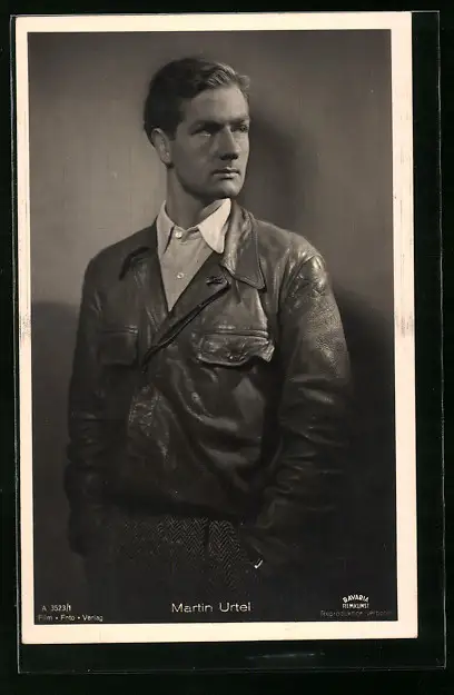 AK Schauspieler Martin Urtel in einer Lederjacke mit ernstem Blick zur Seite