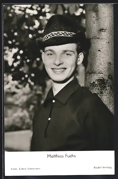 AK Schauspieler Mathias Fuchs lächelnd mit Hut an Baum lehnend