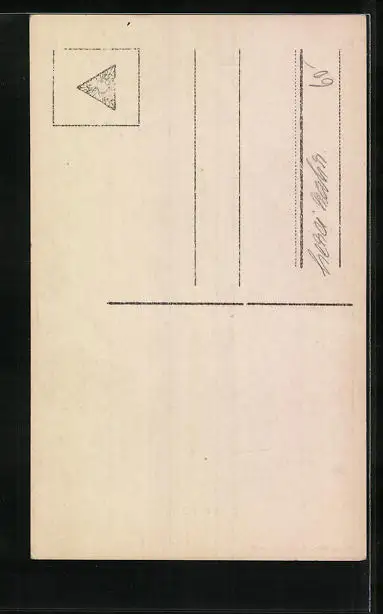 Personenbezogene Daten auf der Rückseite der Karte wurden durch blauen Textmarker unkenntlich gemacht. Die blauen Stellen sind auf die Vorderseite durchgeweicht und wirken sich negativ auf das Postkartenfoto aus
