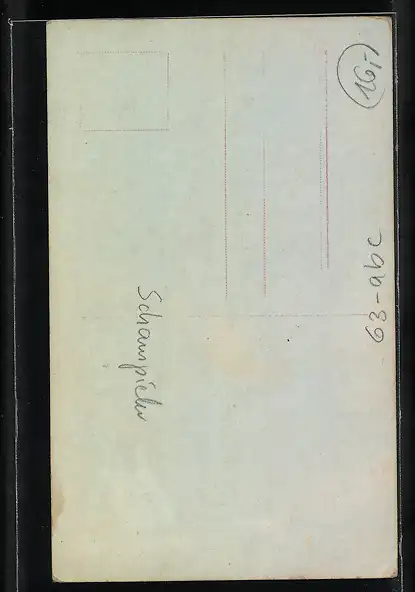 Personenbezogene Daten auf der Rückseite der Karte wurden durch blauen Textmarker unkenntlich gemacht. Die blauen Stellen sind auf die Vorderseite durchgeweicht und wirken sich negativ auf das Postkartenfoto aus