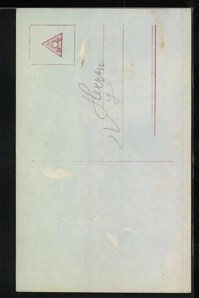 Personenbezogene Daten auf der Rückseite der Karte wurden durch blauen Textmarker unkenntlich gemacht. Die blauen Stellen sind auf die Vorderseite durchgeweicht und wirken sich negativ auf das Postkartenfoto aus