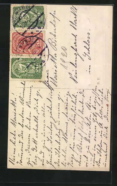 Personenbezogene Daten auf der Rückseite der Karte wurden durch blauen Textmarker unkenntlich gemacht. Die blauen Stellen sind auf die Vorderseite durchgeweicht und wirken sich negativ auf das Postkartenfoto aus