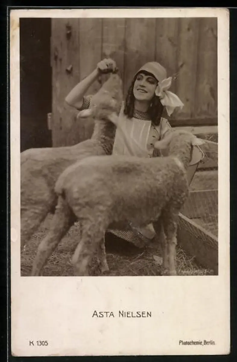 AK Schauspielerin Asta Nielsen füttert Schafe