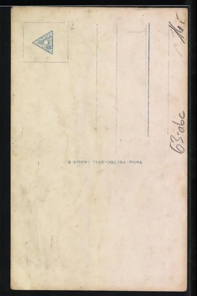 Personenbezogene Daten auf der Rückseite der Karte wurden durch blauen Textmarker unkenntlich gemacht. Die blauen Stellen sind auf die Vorderseite durchgeweicht und wirken sich negativ auf das Postkartenfoto aus